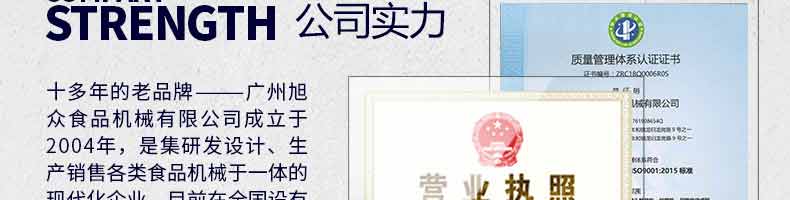 廣州旭眾食品機械有限公司是一家集科研開發(fā),生產(chǎn)設(shè)計,營銷服務(wù)為一體的現(xiàn)代化生產(chǎn)企業(yè)?,F(xiàn)代化生產(chǎn)車間,精湛制造技術(shù),所產(chǎn)機械歷經(jīng)市場重重考驗,不斷贏得海內(nèi)外客戶的贊譽。