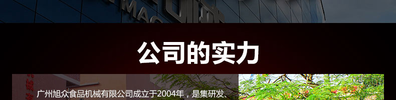 廣州旭眾食品機(jī)械有限公司是一家集科研開(kāi)發(fā),生產(chǎn)設(shè)計(jì),營(yíng)銷服務(wù)為一體的現(xiàn)代化生產(chǎn)企業(yè)?,F(xiàn)代化生產(chǎn)車間,精湛制造技術(shù),所產(chǎn)機(jī)械歷經(jīng)市場(chǎng)重重考驗(yàn),不斷贏得海內(nèi)外客戶的贊譽(yù)。
