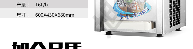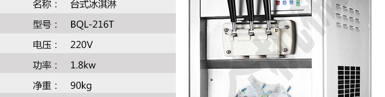 BQL-216T臺式冰淇淋機,●選用國際名牌成熟制冷配套件和高效壓縮機,融合旭眾精湛工藝輔以嚴(yán)格的質(zhì)量控制流程,使產(chǎn)品整體性能及品質(zhì)得以全面提升?!癫捎萌珨?shù)字電腦控制系統(tǒng),選用名牌優(yōu)質(zhì)電器元件,先進的生產(chǎn)工藝,故障診斷,軟硬任意調(diào)制,自動修復(fù)功能,安全精確,可靠性更高?!駥I(yè)成熟制冷系統(tǒng)設(shè)計,選用世界名牌大功率專用壓縮機,大大縮短冰淇淋成型時間,相同時間內(nèi)冰淇淋產(chǎn)量大幅度增加,使您生意火爆時依然得心應(yīng)手,為您創(chuàng)造財富。●安全平穩(wěn)的機械攪拌系統(tǒng),噪音更低、振動更小,使整機運行性能達(dá)到國際先進水平?!翊_保進料溫度在0°C~35°C;環(huán)境溫度5°C~40°C勻可正常使用。