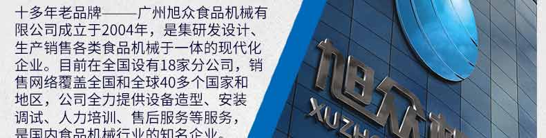 廣州旭眾食品機(jī)械有限公司是一家集科研開(kāi)發(fā),生產(chǎn)設(shè)計(jì),營(yíng)銷(xiāo)服務(wù)為一體的現(xiàn)代化生產(chǎn)企業(yè)?,F(xiàn)代化生產(chǎn)車(chē)間,精湛制造技術(shù),所產(chǎn)機(jī)械歷經(jīng)市場(chǎng)重重考驗(yàn),不斷贏得海內(nèi)外客戶(hù)的贊譽(yù)。