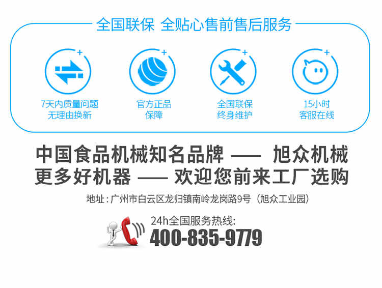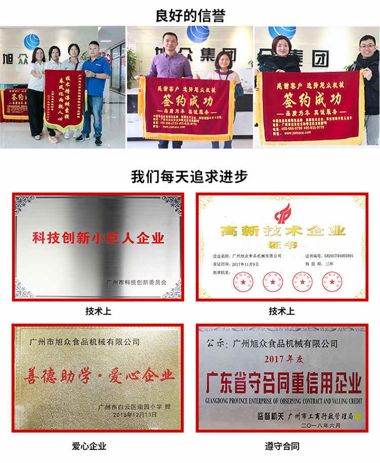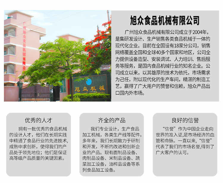 廣州旭眾食品機(jī)械有限公司是一家集科研開(kāi)發(fā),生產(chǎn)設(shè)計(jì),營(yíng)銷服務(wù)為一體的現(xiàn)代化生產(chǎn)企業(yè)?,F(xiàn)代化生產(chǎn)車間,精湛制造技術(shù),所產(chǎn)機(jī)械歷經(jīng)市場(chǎng)重重考驗(yàn),不斷贏得海內(nèi)外客戶的贊譽(yù)。