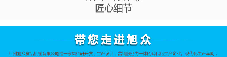 廣州旭眾食品機械有限公司是一家集科研開發(fā),生產(chǎn)設(shè)計,營銷服務(wù)為一體的現(xiàn)代化生產(chǎn)企業(yè)?,F(xiàn)代化生產(chǎn)車間,精湛制造技術(shù),所產(chǎn)機械歷經(jīng)市場重重考驗,不斷贏得海內(nèi)外客戶的贊譽。