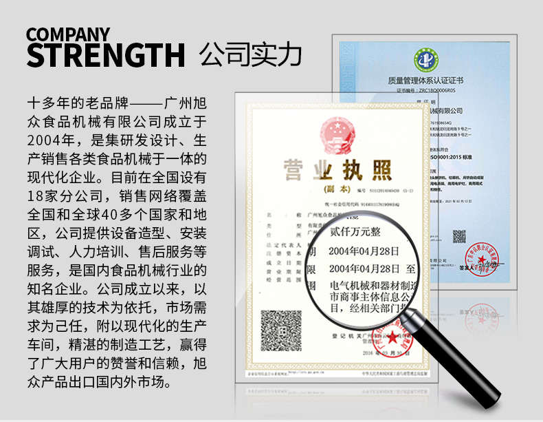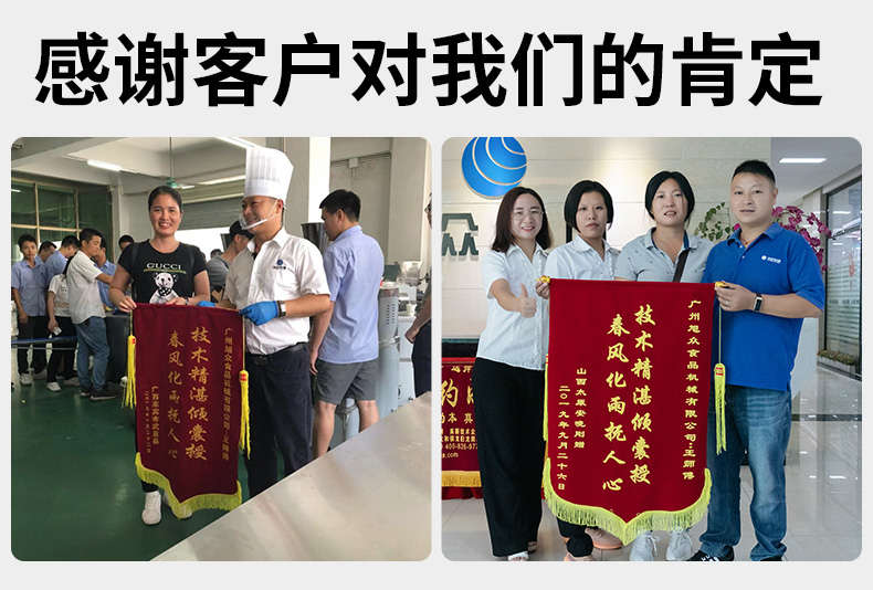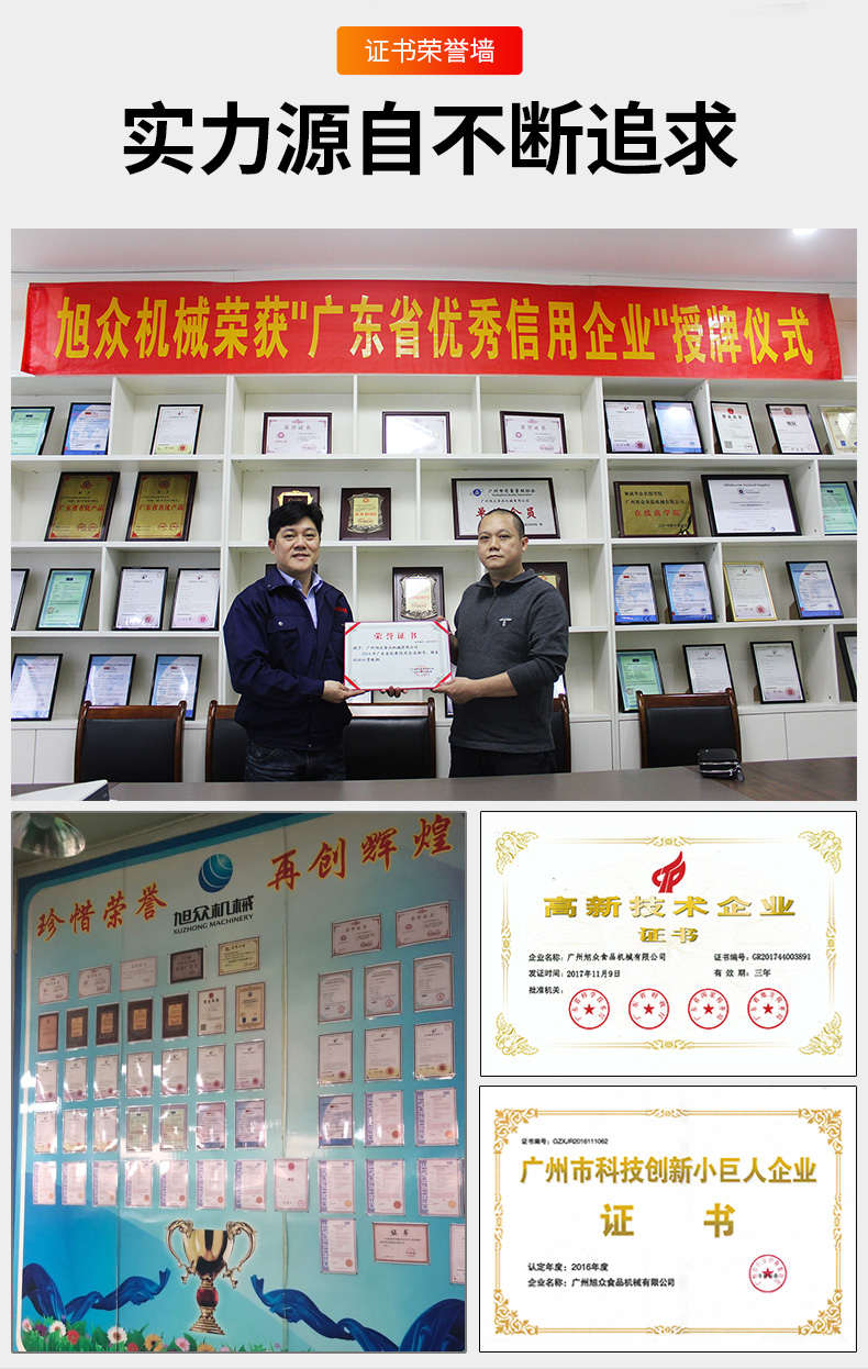 廣州旭眾食品機(jī)械有限公司是一家集科研開發(fā),生產(chǎn)設(shè)計,營銷服務(wù)為一體的現(xiàn)代化生產(chǎn)企業(yè)?,F(xiàn)代化生產(chǎn)車間,精湛制造技術(shù),所產(chǎn)機(jī)械歷經(jīng)市場重重考驗,不斷贏得海內(nèi)外客戶的贊譽(yù)。