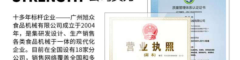 廣州旭眾食品機(jī)械有限公司是一家集科研開發(fā),生產(chǎn)設(shè)計,營銷服務(wù)為一體的現(xiàn)代化生產(chǎn)企業(yè)。現(xiàn)代化生產(chǎn)車間,精湛制造技術(shù),所產(chǎn)機(jī)械歷經(jīng)市場重重考驗,不斷贏得海內(nèi)外客戶的贊譽(yù)。