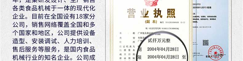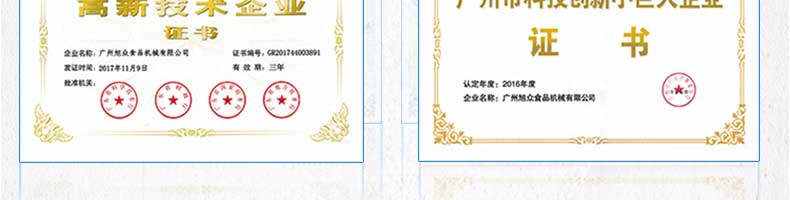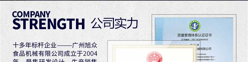廣州旭眾食品機械有限公司是一家集科研開發(fā),生產(chǎn)設(shè)計,營銷服務(wù)為一體的現(xiàn)代化生產(chǎn)企業(yè)。現(xiàn)代化生產(chǎn)車間,精湛制造技術(shù),所產(chǎn)機械歷經(jīng)市場重重考驗,不斷贏得海內(nèi)外客戶的贊譽。